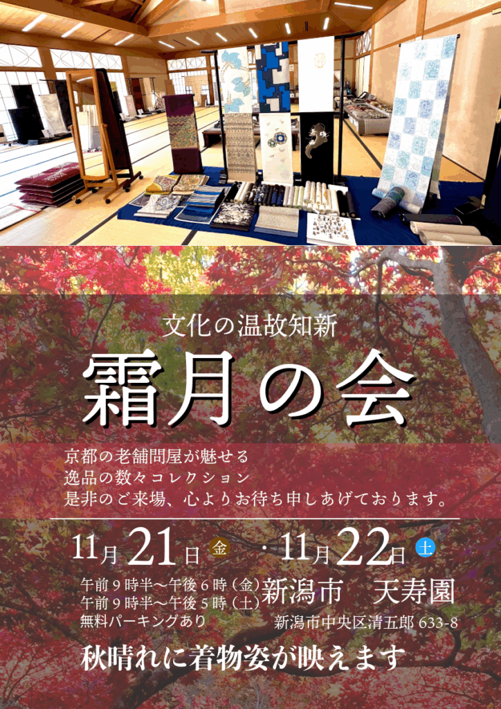 霜月の会 2025年11月15日 京都の老舗問屋が魅せる 逸品の数々コレクション 是非のご来場、心よりお待ち申しあげております。 開催期間: 11月21日(金)~22日(土)時間: 9:30~18:00 最終日17:まで会場: 天寿園